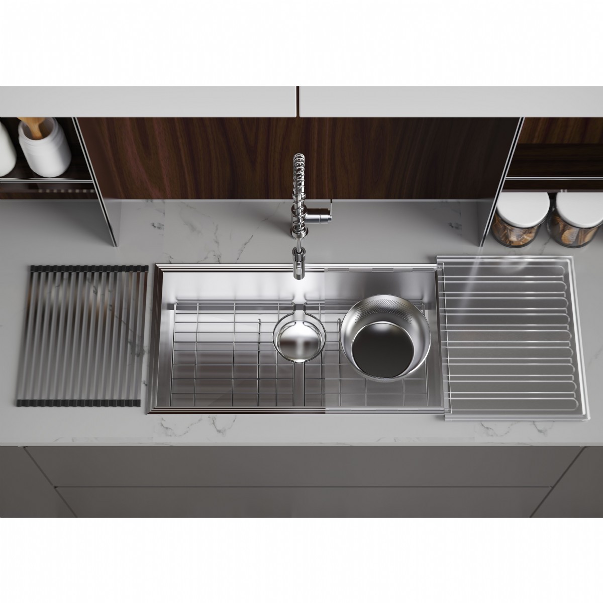 Built-in Organizer Drawer: Integrated diretly into the sink's base cabinet, providing convenient storage for unused accessories.