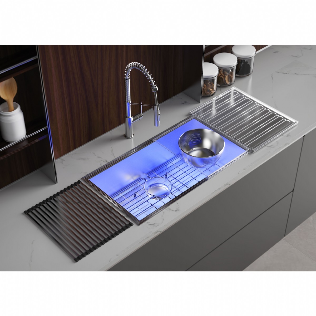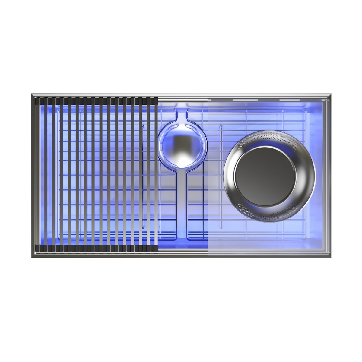 LED-Lit Basin: Multi-color lighting, transitioning from warm to cool tones inside the sink. Creates a stunning visual effect for gatherings and enhances usability.